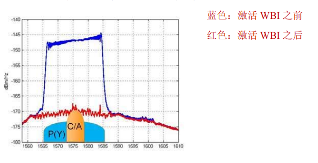 下面给出一个GPS L1信号受到扫频干扰信号污染:激活WBI前后的对比: